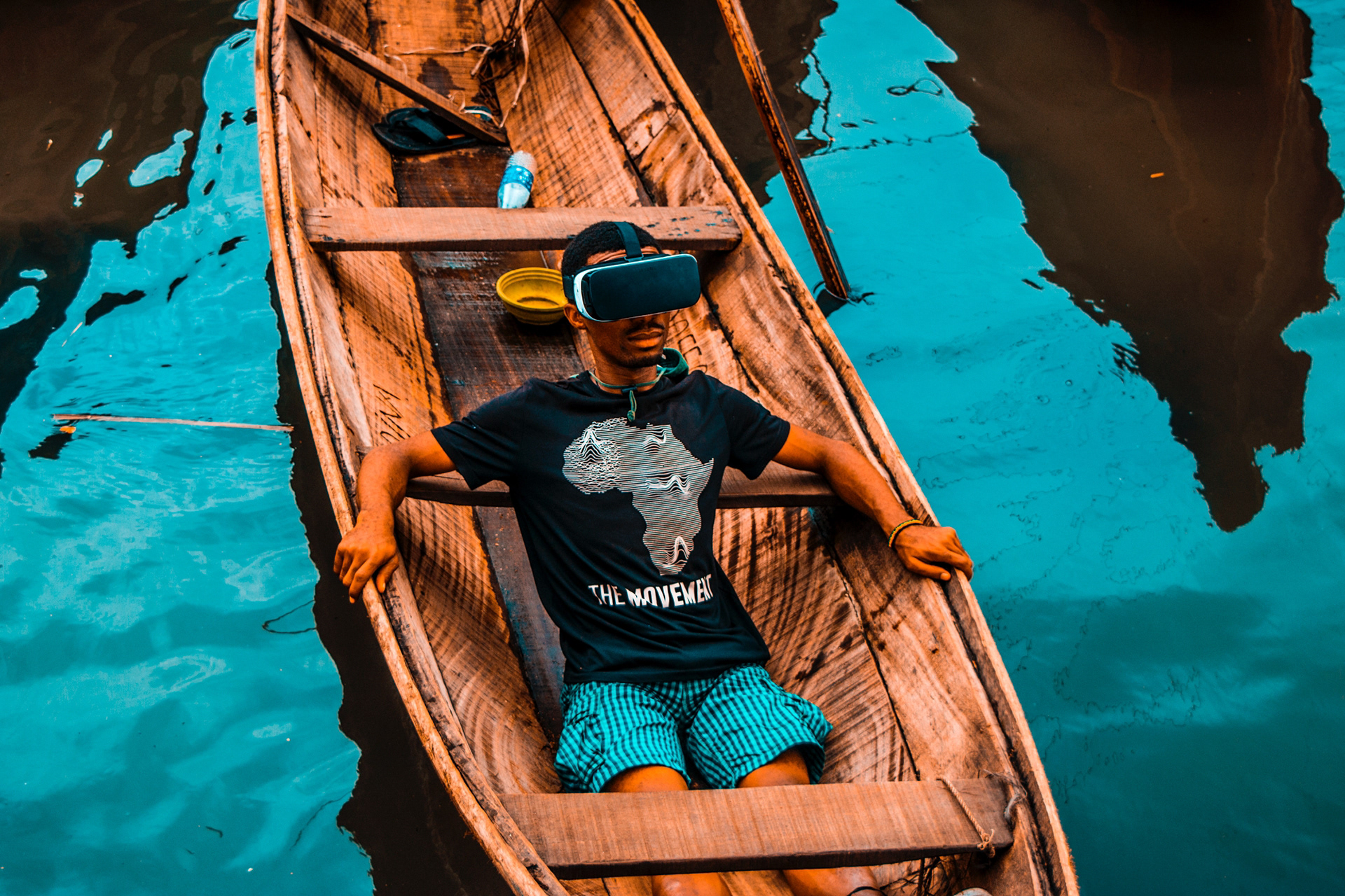 카누에 앉아 VR 장비를 사용하는 슬럼 커뮤니티의 젊은 남성